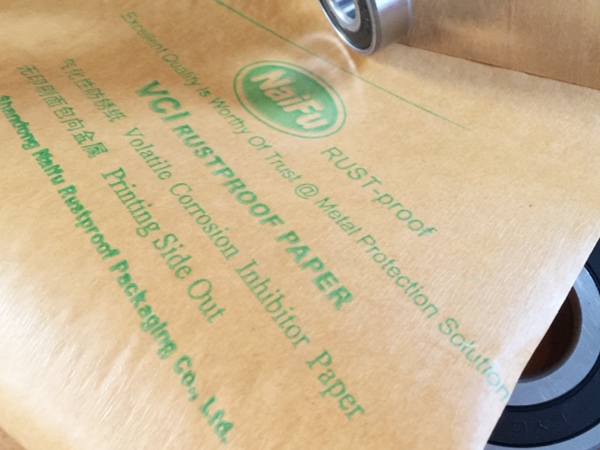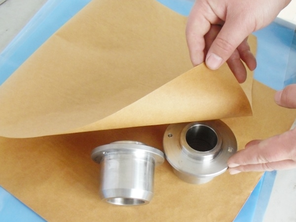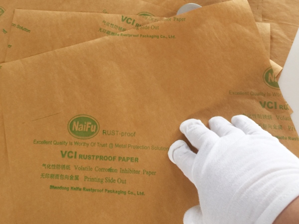 4、包裝過程---將含有緩蝕劑的面朝向金屬包裝,不覆膜防銹紙可作為金屬產(chǎn)品間墊層隔材使用,以免其他材質(zhì)阻隔材料含S、CL化學(xué)成分,影響防銹效果